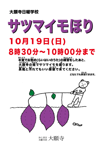 日曜学校 10月19日(日)8:30〜10:00 サツマイモほり 大願寺の畑でジャガイモ掘りをします。長靴と汚れてもいい服装で来てください 報恩講 12月13日(土)9:30〜 13:00〜 布教使 岡山県 高梁市 浄福寺 山下瑞円師 どなたでもお参りできます。どうぞお聴聞にお参りください